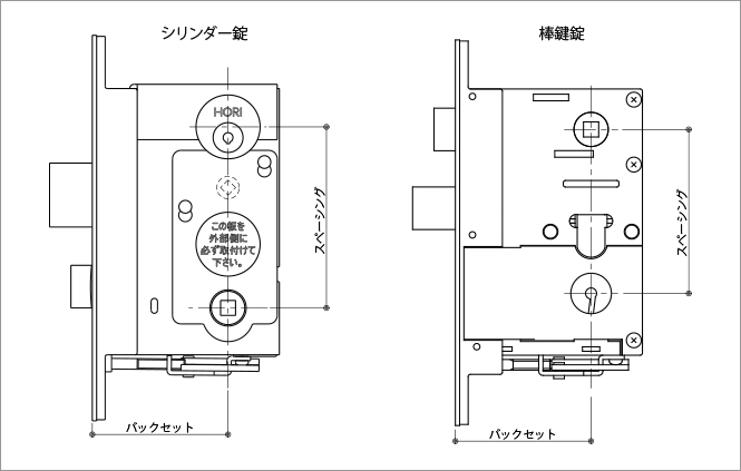 ノブまたはレバーハンドルの回転中心と、シリンダーを別々に備える箱錠で、その中心間の距離。棒鍵錠の場合、 ノブまたはレバーハンドルの回転中心と、棒鍵の回転中心までの距離。
